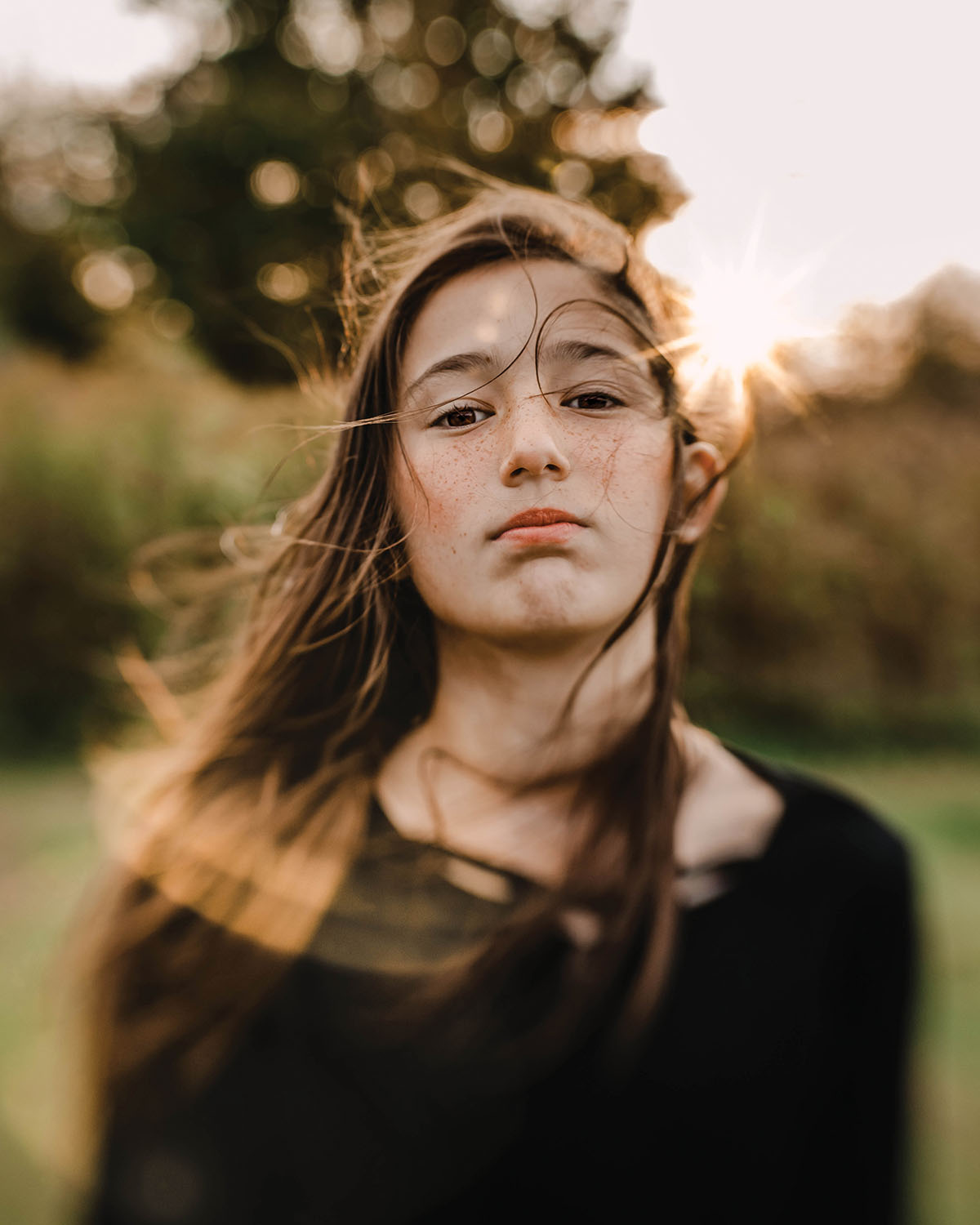 Wendi: The direct eye gaze in this image draws me in and allows me, the viewer, to feel connected right away. The sun flare behind the subject is beautiful and adds a dramatic effect. Lindsay’s choice to use blur and movement adds depth and drama to this portrait, creating a dreamy feeling that only enhances the most important part of this image — the connection to the subject’s eyes.