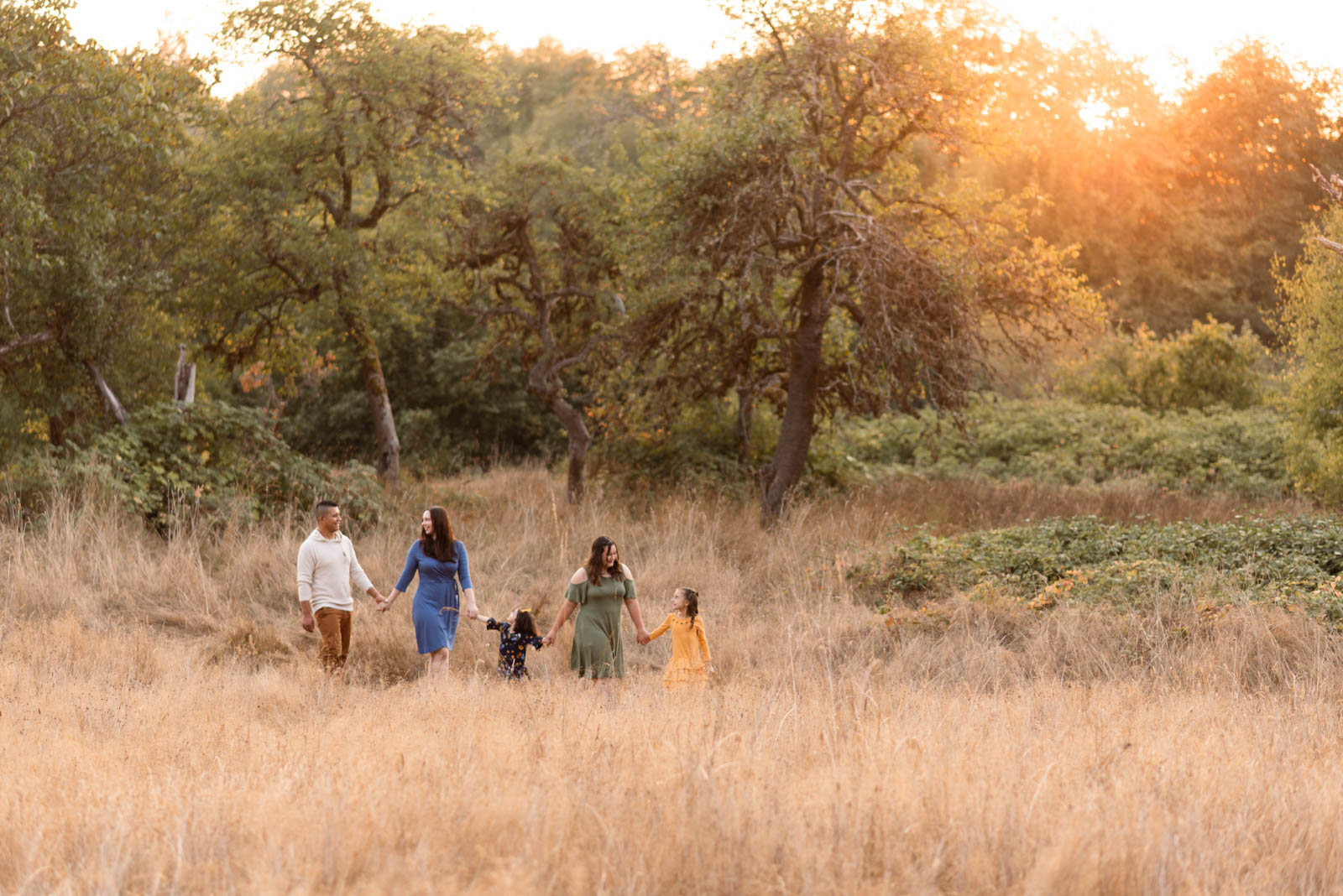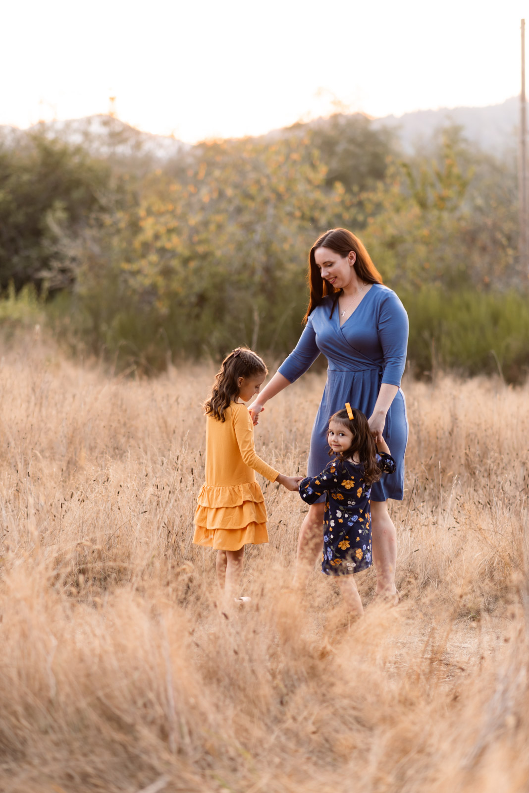 This is one of my favorite activities to use near the end of a family session or whenever the light is golden and best. I have the family line up holding hands with the sun behind them and direct them to walk in a straight line, looking either straight ahead or at each other (just not at me).