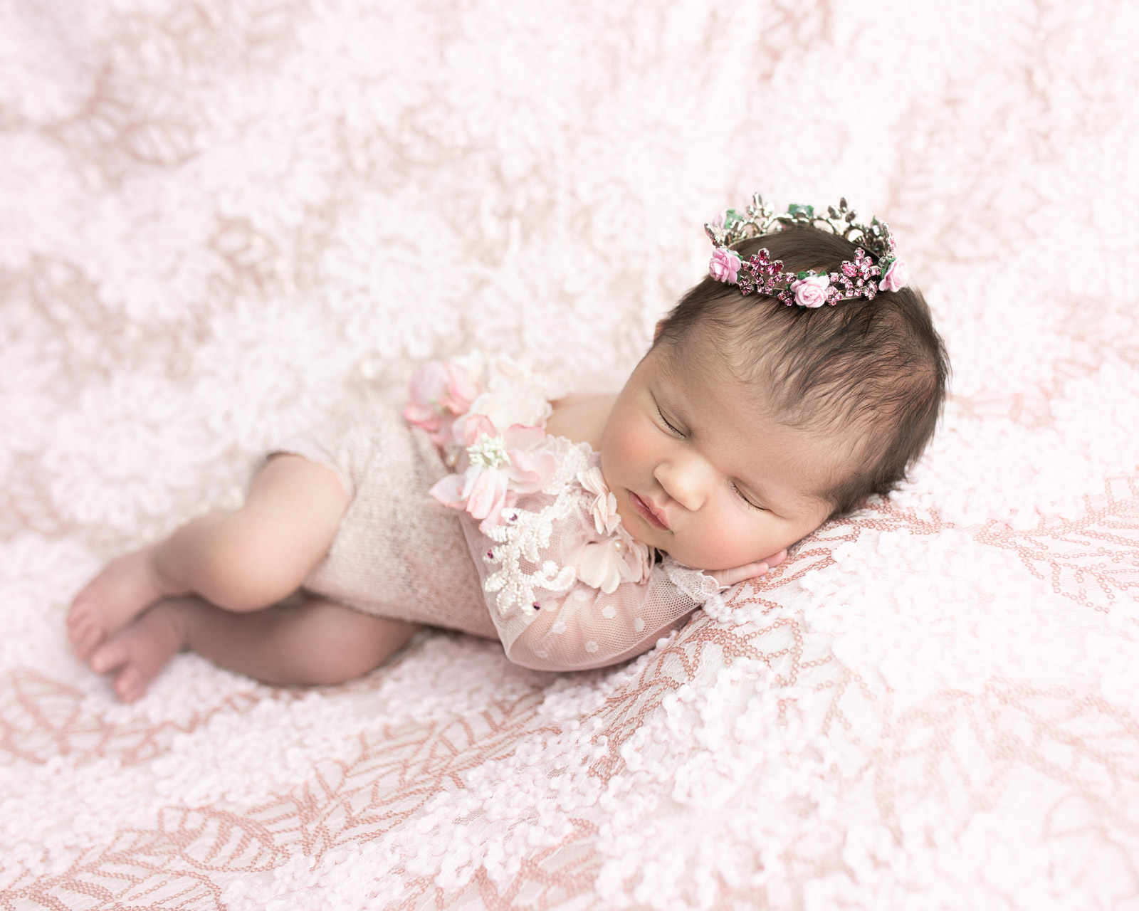 I try not to show naked baby photos on my website, so generally clients don’t ask me for those (people want what they see!) Instead I do those types of poses with the little boys in pants or knitted outfits from Fleur Foto Knits, and baby girls in the petal rompers from Mia Joy Studio. If parents do request a naked newborn pose, I am happy to accommodate and take the baby’s diaper off for the very minimum amount of time necessary to get the one photo.